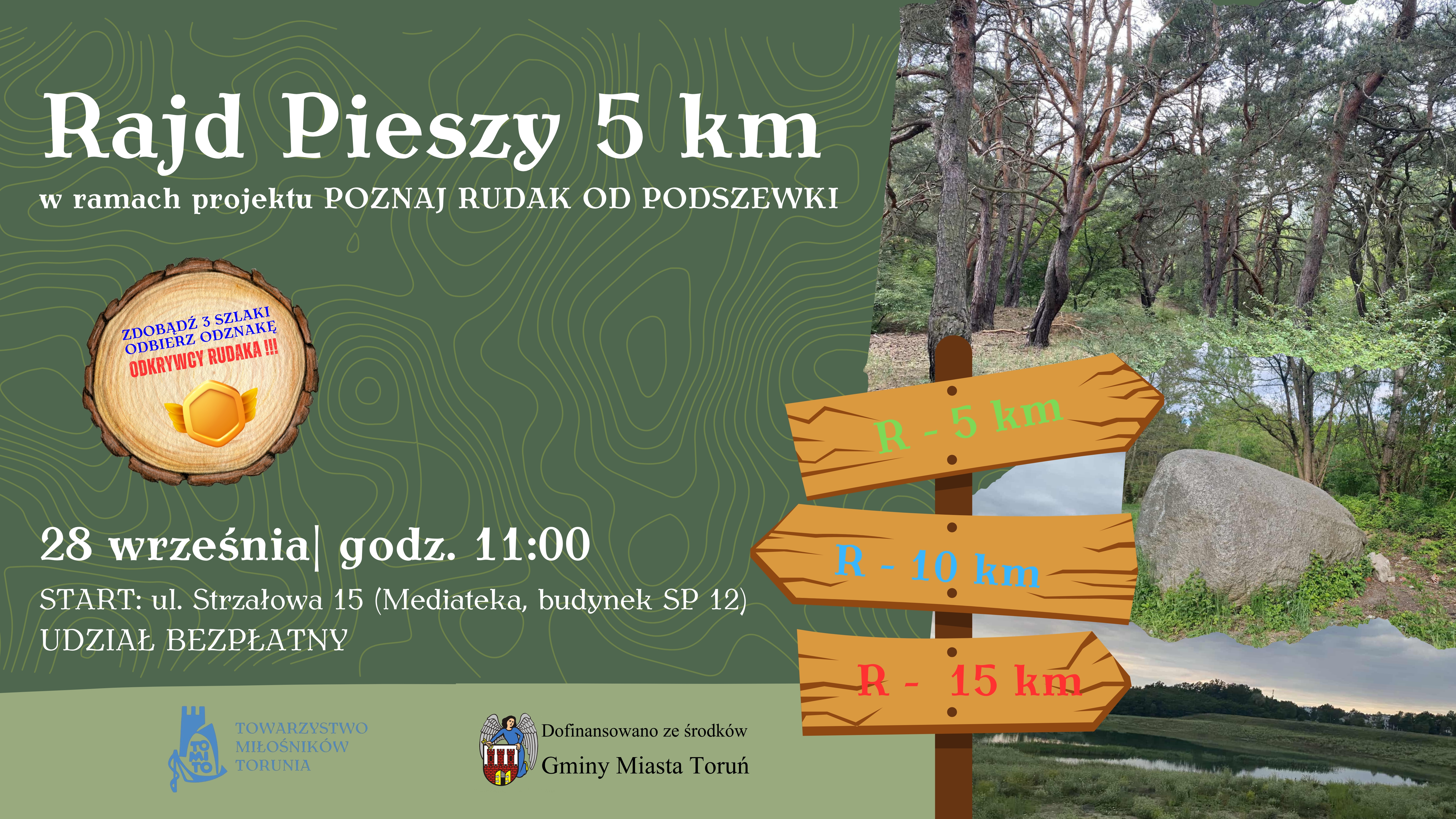 28 września (niedziela) Towarzystwo Miłośników Torunia zaprasza wszystkich chętnych na pilotażowy rajd pieszy po Rudaku, trasą projektowanego szlaku "zielonego" o długości 5 km. Jest to odsłona pierwszej z trzech pętli ścieżek (5 km, 10 km, 15 km) powstających w ramach projektu „Poznaj Rudak od podszewki”, na które swoje głosy oddali mieszkańcy Rudaka w budżecie obywatelskim w 2024 r.