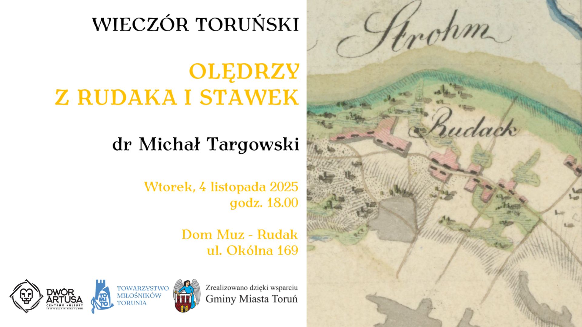 Wieczory Toruńskie to cykl spotkań poświęconych dziedzictwu i historii Torunia oraz jego mieszkańcom. Prelekcje, dyskusje i tematyczne spacery odbywające się pod tym hasłem organizowane są przez Towarzystwo Miłośników Torunia w ścisłej współpracy z toruńskimi instytucjami kultury - Książnicą Kopernikańską, Muzeum Diecezjalnym, Muzeum Okręgowym i Centru, Kultury Dwór Artusa w Toruniu. Działanie realizowane jest dzięki finansowemu wsparciu Gminy Miasta Toruń. Na wszystkie wydarzenia z cyklu "Wieczory Toruńskie" obowiązuje bezpłatny wstęp. Serdecznie zapraszamy!