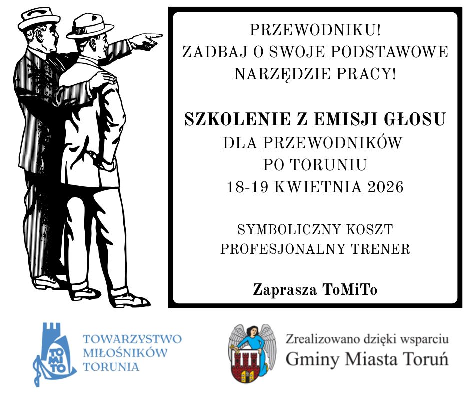 Zapraszamy na szkolenie przewodnickie z emisji głosu organizowane przez Towarzystwo Miłośników Torunia przy wsparciu Gminy Miasta Toruń. Szkolenie skierowane jest do przewodników turystycznych – osób pełnoletnich, zawodowo oprowadzających wycieczki po Toruniu.