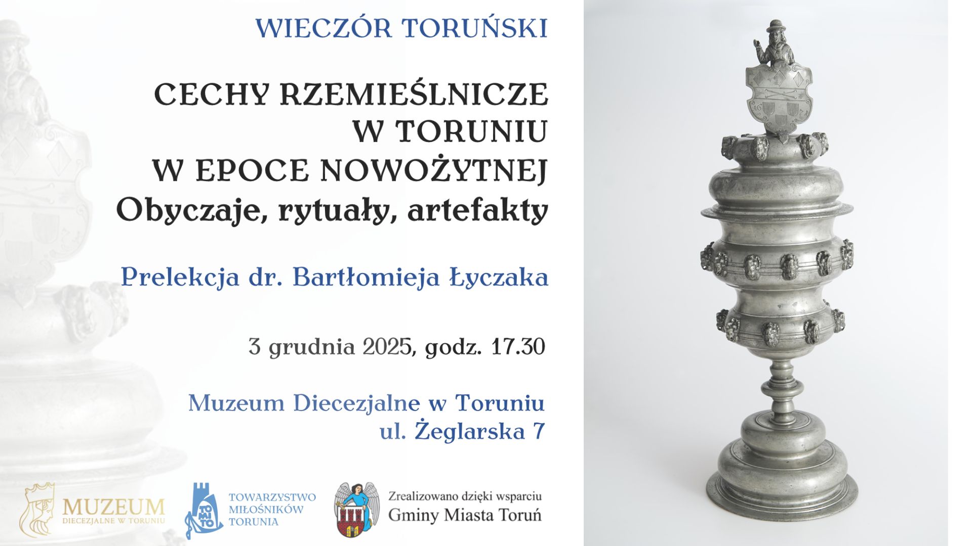 Towarzystwo Miłośników Torunia i Muzeum Diecezjalne w Toruniu zapraszają na prelekcję dra Bartłomieja Łyczaka z Uniwersytetu Gdańskiego poświęconą zwyczajom i ceremoniom cechowym w XVI-XVIII wieku. Wspólnie przyjrzymy się dawnym rytuałom praktykowanym w Toruniu m.in. przy okazji zebrań, przyjmowania nowych członków czy podczas pogrzebów. W ramach wykładu omówione zostaną również dzieła sztuki używane przez toruńskie cechy podczas ich ceremonii, takie jak berła, skrzynie, wilkomy i kufle.