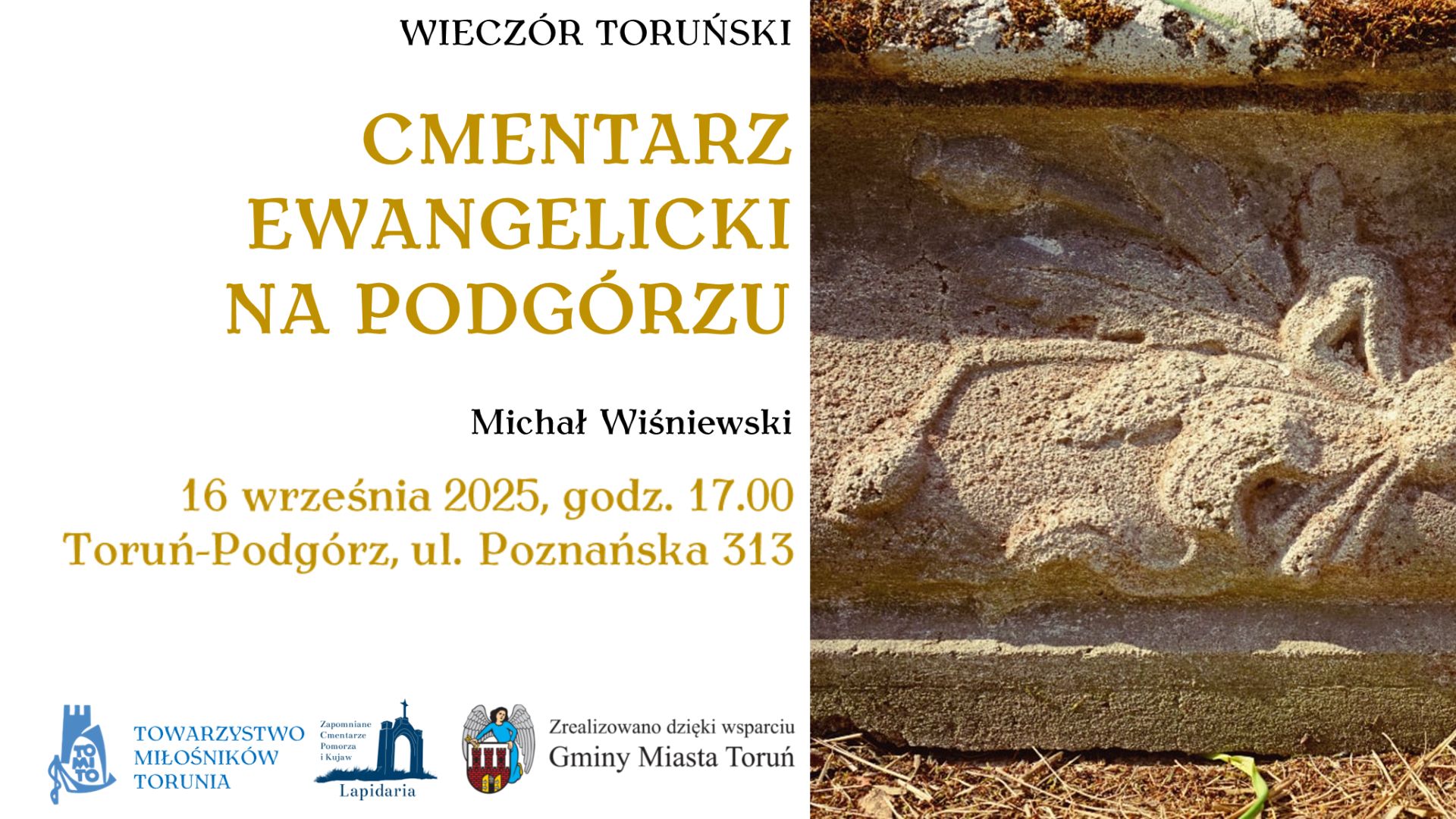 Data publikacji: 2025-09-14Zapraszamy na Wieczór Toruński, który odbędzie się w wyjątkowym miejscu – na dawnym cmentarzu ewangelickim przy ul. Poznańskiej 313 w Toruniu. Oprowadzi nas po nim Michał Wiśniewski ze Stowarzyszenia Lapidaria. Zapomniane Cmentarze Pomorza i Kujaw, autor książki poświęconej ewangelickim cmentarzom lewobrzeżnego Torunia wydanej nakładem ToMiTo. W czasie uważnego spaceru zwrócimy uwagę na pozostałości dawnych nagrobków i ich dekoracji, dowiemy się też więcej o pochowanych na tym cmentarzu mieszkańcach dawnego Podgórza i okolic.