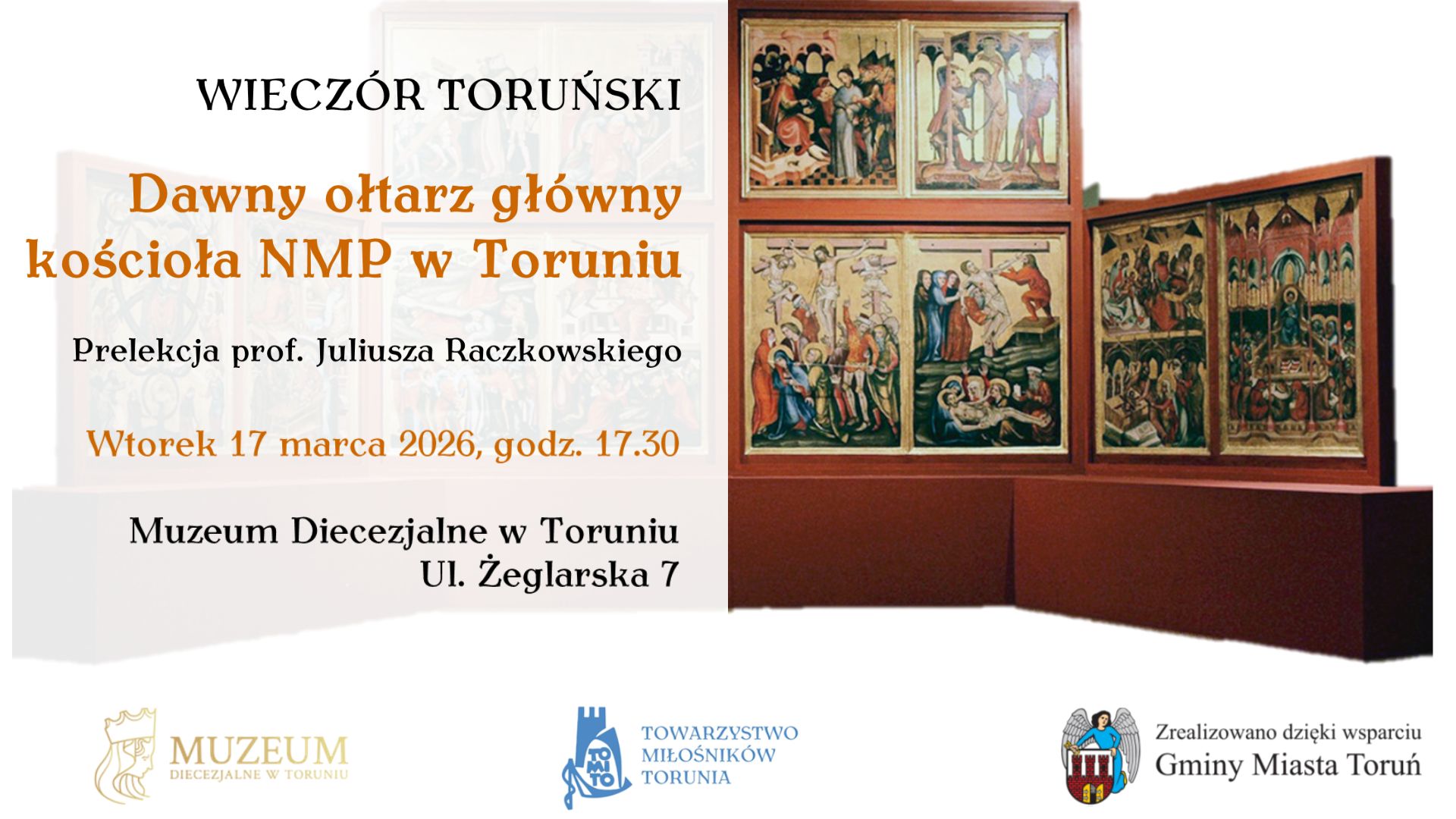 Serdecznie zapraszamy na kolejny Wieczór Toruński, podczas którego prof. Juliusz Raczkowski z Wydziału Sztuk Pięknych UMK wygłosi prelekcję poświęconą tzw. Poliptykowi Toruńskiemu - zespołowi cennych, malowanych tablic przechowywanych obecnie w Muzeum Diecezjalnym w Pelplinie, uznawanych za pozostałość gotyckiego, głównego ołtarza franciszkańskiego kościoła NMP w Toruniu. Spotkanie odbędzie się 17 marca o godz. 17.30 w Muzeum Diecezjalnym w Toruniu, ul. Żeglarska 7. Wstęp bezpłatny.